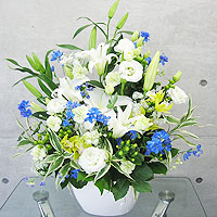 シンビジウム・デルフィニウム・カーネーション・ヒペリカム・レースフラワー・レモンリーフ・ドラセナ
