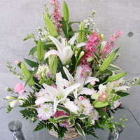 トルコキキョウ・くじゃく草・スプレーカーネーション・フリージア・ラクスパー