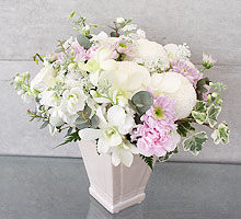 デンファレ・スプレーマム・カーネーション・レースフラワー・ストック・ユーカリ・アイビー・レザーファン