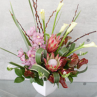 シンビジウム、アンスリウム、カラー、オーニソガラム、猫柳、ニューサイラン、レモンリーフ、ゴッドセフィアナ