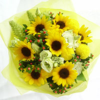 ピンポンマム・トルコキキョウ・ヒペリカム・あわ・ドラセナ